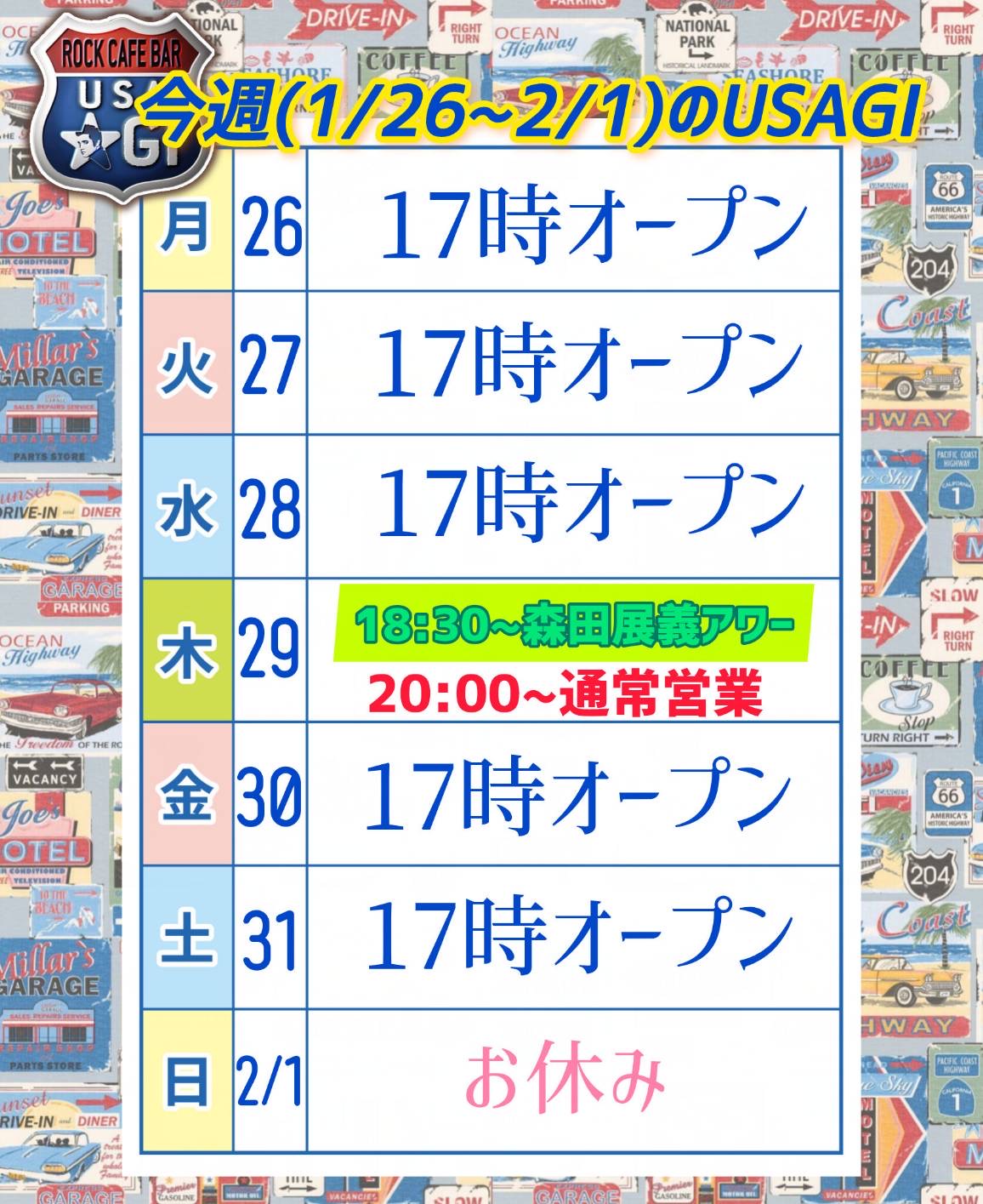 今週は日曜日がおやすみです。よろしくお願いします。